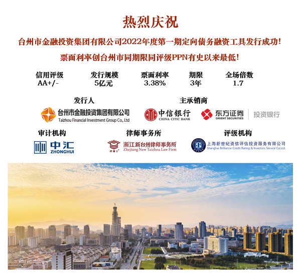 5月30日,臺州市金融投資集團有限公司(以下簡稱市金投集團)首單非公開定向債務(wù)融資工具(PPN)成功發(fā)行。發(fā)行金額5億元,期限3年,票面利率3.38%,由中信銀行與東方證券聯(lián)合承銷,全場認購倍數(shù)1.7倍。市金投集團持續(xù)關(guān)注市場動態(tài),緊抓央行降準和貸幣政策寬松窗口,在各中介機構(gòu)的支持和市場投資者的高度認可下,本次PPN票面利率創(chuàng)臺州市同期限同評級PPN有史以來最低。